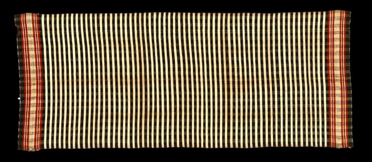 The Mnong are a very small and isolated group from the Dac Lac province, Central highlands, Vietnam. A traditional dress of a Mnong female includes a wrap-around skirt, here created from three woven panels joined side by side, with a dominant geometric pattern in the centre portion of the garment. Weaving was one of the essential skills of Mnong women who were clever at adding abstract design elements and are said to be significant for men when choosing their brides. Woven on a back-strap loom and then embroidered. Light embellishments and fringe tufts.